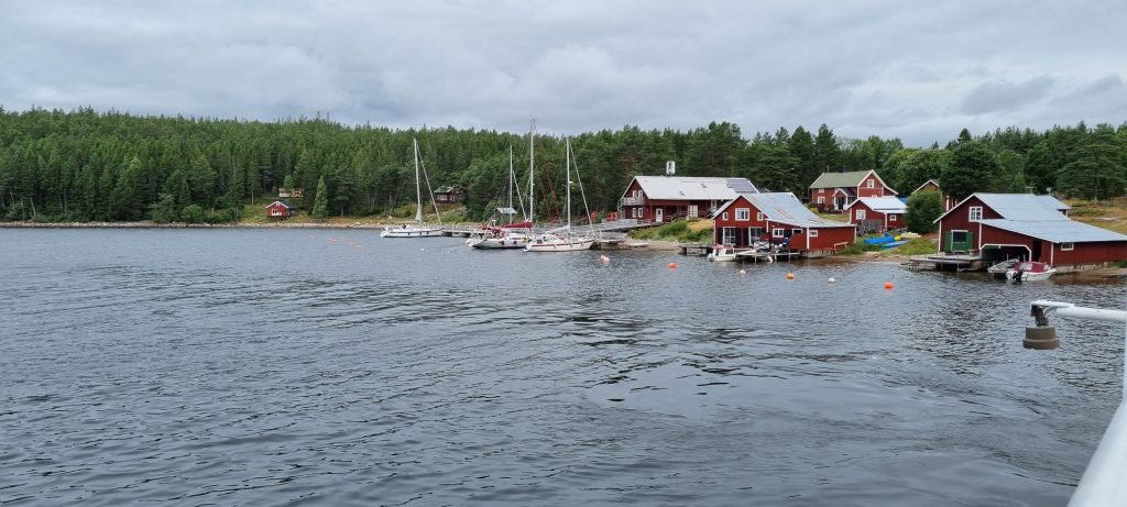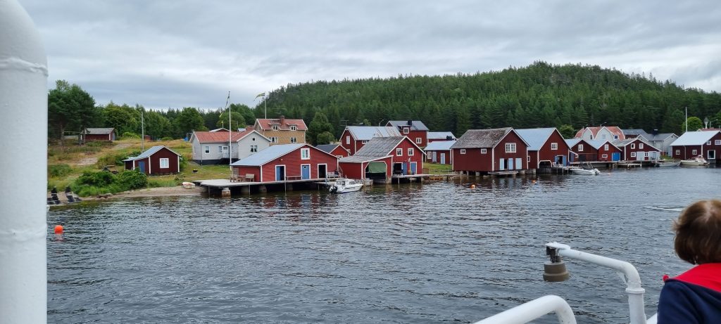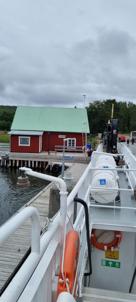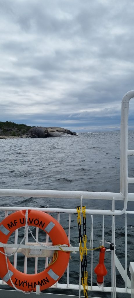 Jag åkte iväg från Snibbens camping tidigt på morgonen för att åka till Köpmanholmen, en tur på drygt 70 km som bl.a. går över Högakustenbron och förbi Skuleberget. Köpmanholmen ligger ca. 25 km söder om Örnsköldsvik. Ska man åka ut i skärgården är Köpmanholmen en bra utgångspunkt. Jag hade bestämt mig för att åka ut till Ulvön, en av de mest välbekanta öarna i området, och båtturen dit tog omkring två timmar, men då stannade man till på ett flertal fina ställen med pittoreska hamnar. Det blåste och var lite sjögång den här dagen, men det var bara ett fåtal resenärer som blev lite sjösjuka. Personalen på båten gick runt och erbjöd påsar till passagerarna, men det var ingen som använde dem, vad jag såg. Trevlig var det att från båten uppleva den fina skärgården och få se de olika hamnarna, som t.ex. Fjären och Trysunda.