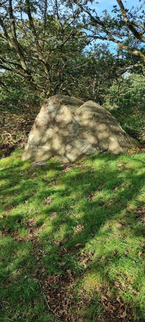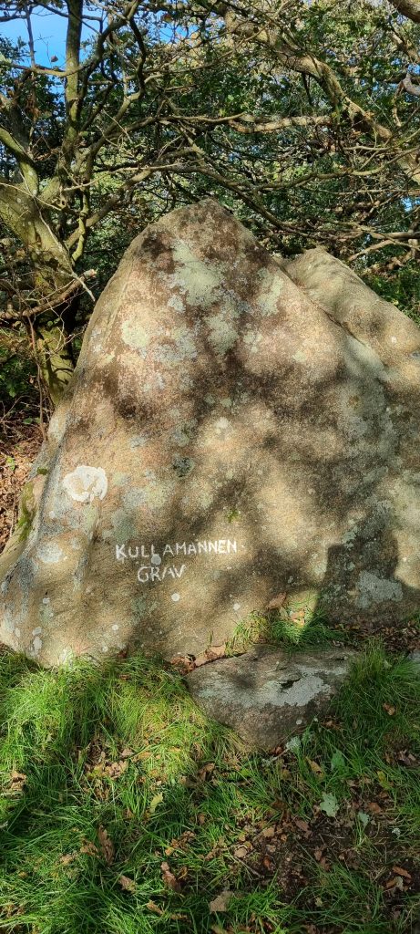 Efter någon kilometer på stigen letade vi efter, och hittade, den lilla stigen som går upp till Kullamannens grav. Det är ingen plats som är utmärkt med skyltar, men om man håller ögonen öppna efter en liten stig till vänster, innan att huvudstigen svänger ut mot vägen, så kan man gå stigningen upp till den stora stenen som kallas “Kullamannens grav”.